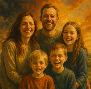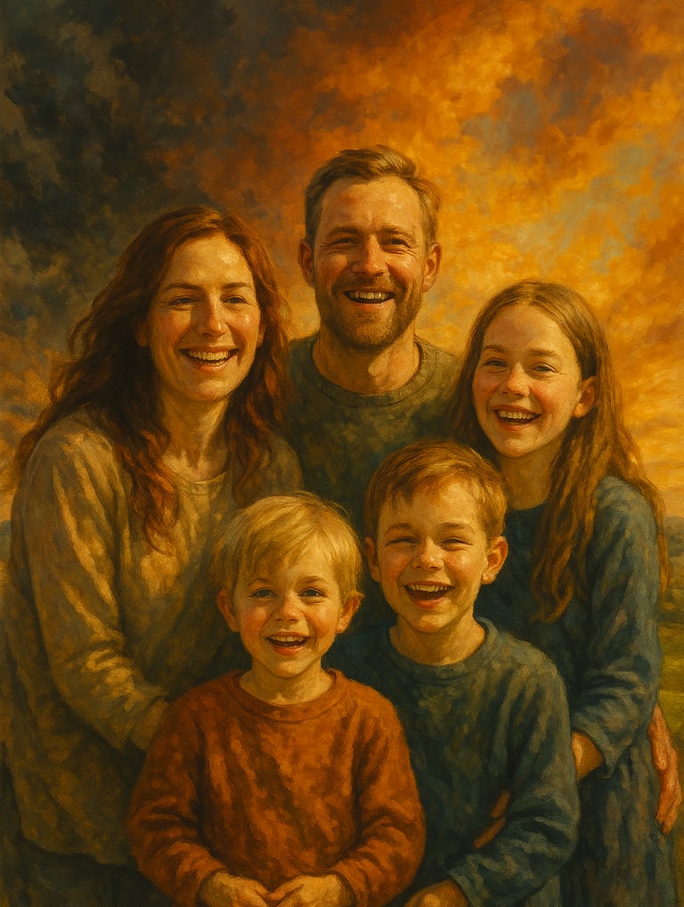 Symbolsk maleri af en familie i fællesskab, hvor mørke skyer bag dem opløses af sollys. Men harmoni kommer ikke altid af sig selv. En god harmoni kræver oftest en aktiv indsats.